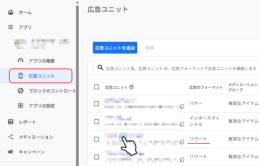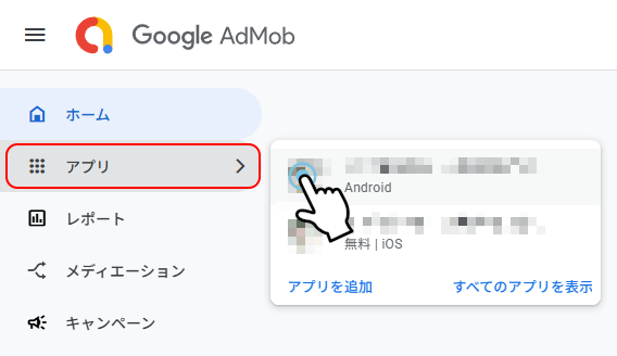 AdMob 管理画面 → アプリ → ご自身のアプリを選択