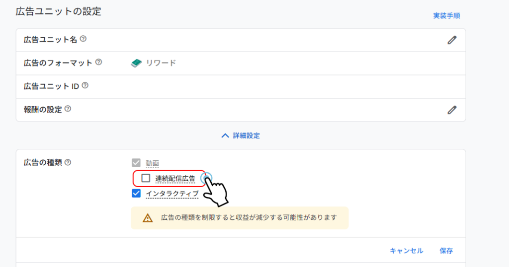 詳細設定を開くと、『連続配信広告』のオプションが出現するので、これをオフにします。